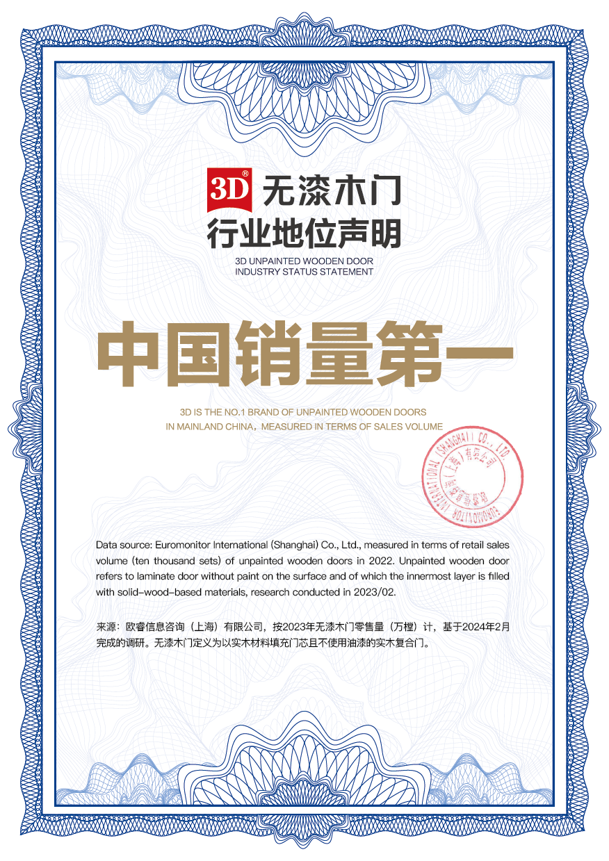 欧睿国际认为,全国销量第一的认证表明了消费者对3D无漆木门品牌的信赖与支持。